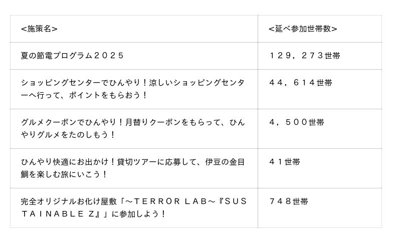 本プロジェクトでは、東急でんき加入者を対象に、電力需給のひっ迫が予想される時間帯を「節電タイム」として設定し、各家庭の節電量に応じた特典を付与する「夏の節電プログラム2025」を実施しました。また、東急線沿線にお住まい・お勤めの方、東急線沿線を訪れる方も参加できる完全オリジナルお化け屋敷の開催や東急線沿線の商業施設で利用できるちょっと涼しくなるような特典・クーポンの配布など、「気分もカラダもひんやりする体験」を展開することで、お出かけによるクールシェアを誘発し、誰でも楽しく参加できる節電アクションを提案しました。