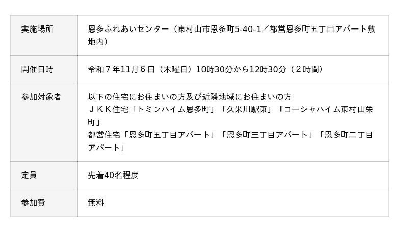 JKK東京(東京都住宅供給公社:東京都渋谷区、理事長:浜 佳葉子、以下「JKK」)は、東京都、地方独立行政法人東京都立病院機構(以下「東京都立病院機構」)と令和6年3月に締結した包括連携協定に基づき、令和7年11月6日(木曜日)に下記のとおり東村山市で高齢者向けのイベントを3者共催により実施します。