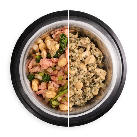 豚肉の良質なたんぱく質と、大根・春菊の食物繊維やカリウムは筋肉維持と消化サポートに役立ちます。活動量の多い成犬やシニア犬の健康維持食としておすすめです。