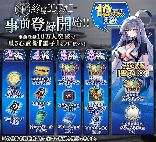 事前登録開始を記念して、事前登録者数が一定数を突破するごとに、豪華特典を入手することができるキャンペーンを開催します。戦力強化に役立つ資源ピックボックスをはじめとした、ゲーム序盤に役立つアイテムが手に入るお得なキャンペーンです。10万人を突破した際は、星5心武衛『雲子』と10万人突破限定アイコンフレームが手に入ります。