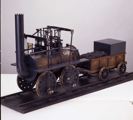 1825年、ストックトン~ダーリントン間に、世界初の公共鉄道が開業しました。その時走った蒸気機関車がロコモーション号で、ジョージ・スチーブンソンが製作しました。ボイラーの上には2つのシリンダーが垂直に立ち、たくさんのロッドやクランクを装備していました。ロコモーション号の実物は、ダーリントンにある「ヘッド・オブ・スチーム(Head of Steam)」という鉄道の博物館に展示されています。