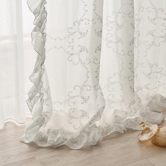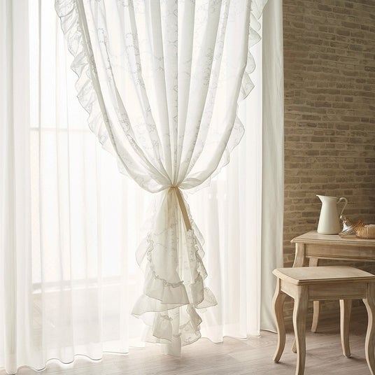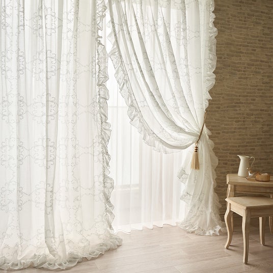 ヨーロッパで愛されるアカンサスパターンの刺繍レースを、フェミニンなフリルスタイルでお届け。刺繍レースカーテンの裾・両サイドを贅沢に、たっぷりと生地を使用してフリルスタイルに仕上げました。エレガントで甘い、けれど、気品があって上品。そんな、乙女の憧れシャビーシックな空間を叶えてくれるフリルカーテンをあなたの窓辺に。