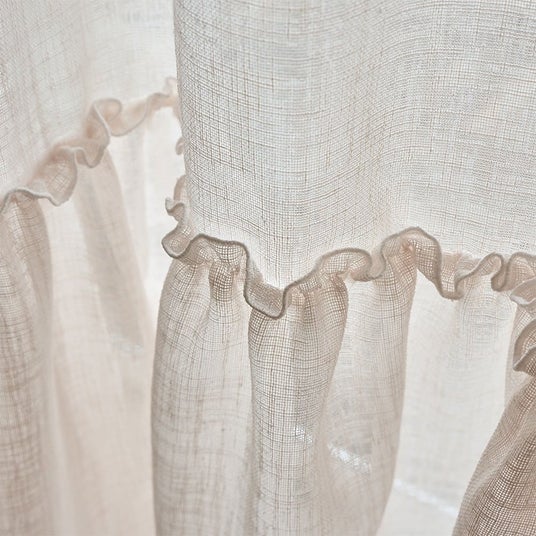 見れば見るほどに可愛い、カントリー風のフリルレースカーテン。とびっきり可愛いフリルレースカーテンを、あえて天然素材風の生地でお仕立てしました。スカートフリルの高さは、試行錯誤の末にたどり着いた50cm。このバランスが、1番可愛くて、1番お洒落に見えるのです。「可愛い空間にしたいけれど、こってり甘い雰囲気はちょっと苦手」そんなあなたに、イチ推しの1枚なのです♪
