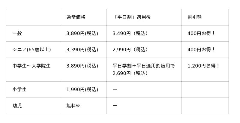 ※「平日割」の対象は一般・シニア料金のお客様です。