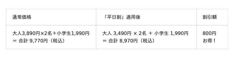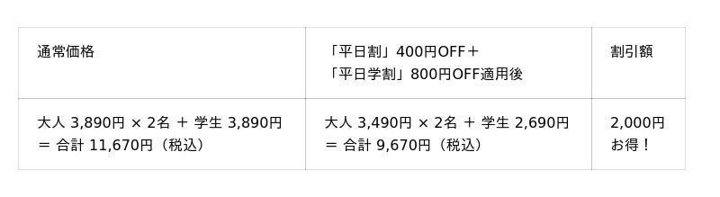 ※「平日割」・「平日学割」はキャンペーン開催期間中の土日・祝を除く平日のみが割引適用となります。