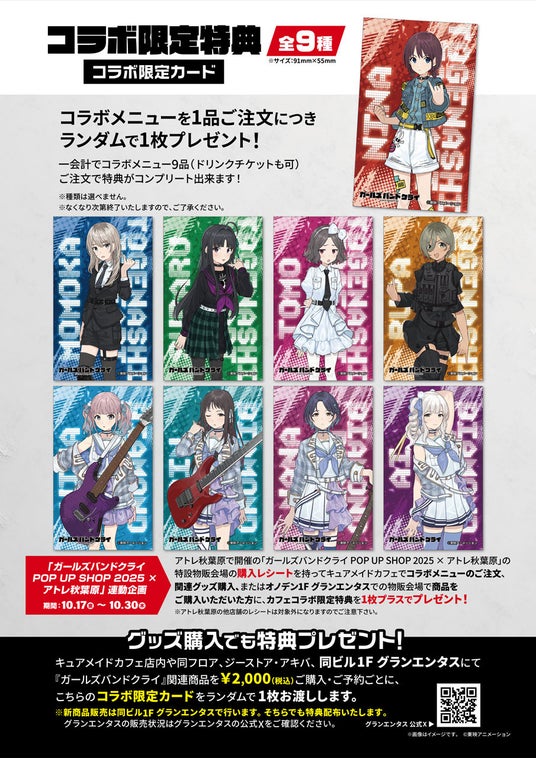 キュアメイドカフェ店内や同フロア、ジーストア・アキバ、同ビル1階グランエンタスにて『ガールズバンドクライ』関連商品を2,000円(税込)ご購入・ご予約ごとに、カフェで配布しているコラボ限定カードをランダムで1枚お渡しします。