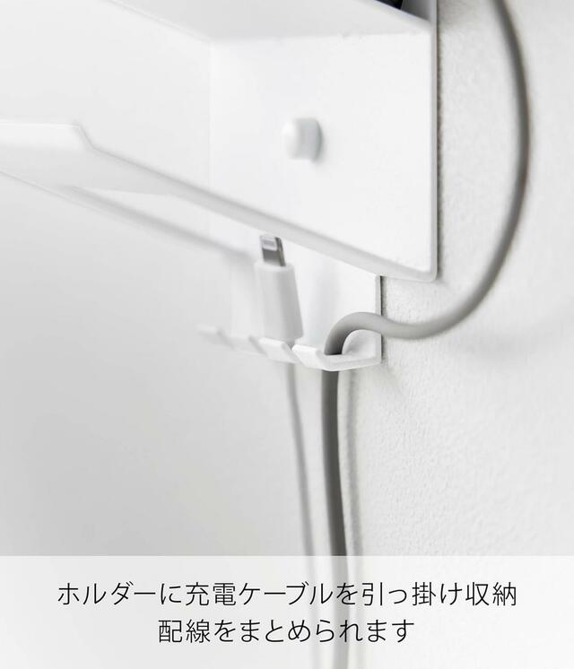 収納ラックにはホルダーが付属しており、充電ケーブルの差し込み口を引っ掛けて収納できる仕様。使わないときもケーブルが垂れず、見た目がスマートにまとまります。