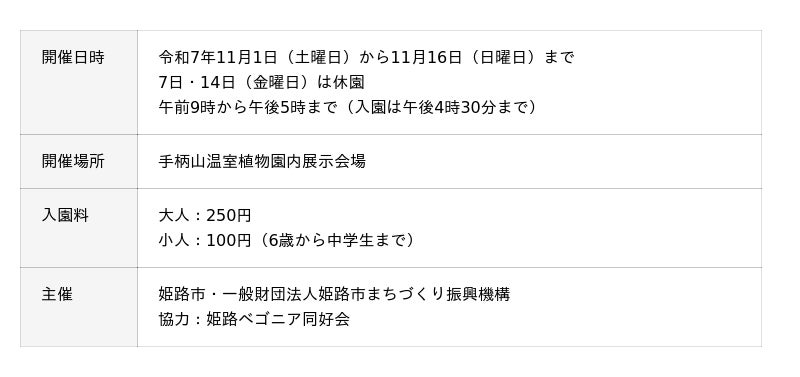 11月1日(土曜日)・2日(日曜日)各日50名様に先着順抽選にてベゴニアの苗をプレゼント展示説明会:11月1日(土曜日)午前10時から。参加費無料、予約不要。入園料が必要。