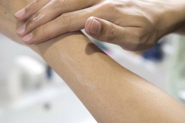 みずみずしいテクスチャーのクリームを手でよく伸ばして。