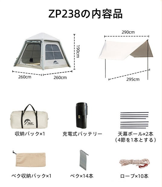 内蔵充電式バッテリー、ワンタッチで膨らみ、満タンで自動停止、アウトドア初心者でも一人でできます。