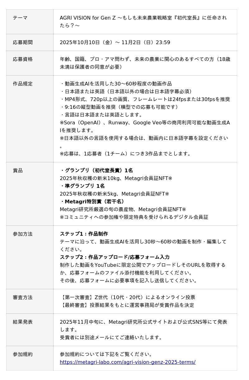 審査の最大の特徴は、Z世代(10代・20代)がオンライン投票で審査員となる点です。グランプリには2025年秋収穫の新米10kgと、限定特典が受けられる「Metagri会員証NFT」を授与します。