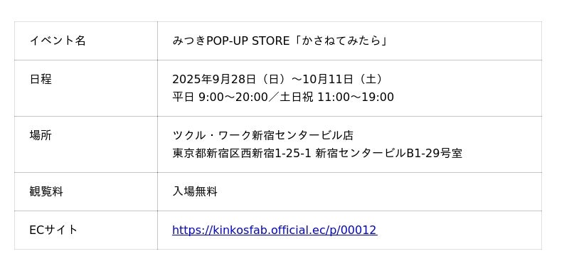 キンコーズ・ジャパン株式会社(本社:東京都港区、代表取締役社長:渡辺浩基、以下 キンコーズ)は、抽象画家・みつき(以下、みつき)とのコラボレーションによるポップアップストアイベント「かさねてみたら」を、10月11日(土)まで、キンコーズのコワーキングスペース、ツクル・ワーク 新宿センタービル店にて開催中です。本イベントは、みつきの作品世界を”体感”できるポップアップストアで、キンコーズのオンデマンド印刷技術を活用し、アート作品を素材としたオリジナルグッズの販売と、空間全体を使った体験型展示(インスタレーション)を組み合わせています。