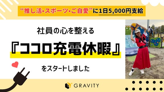 千葉市を拠点に広報PR事業を展開する株式会社グラヴィティPR(本社:千葉県千葉市緑区、代表取締役:山田佳奈恵)は、2025年10月1日より、「推し活・スポーツ・ご自愛」の3要素からなる特別休暇制度《ココロ充電休暇》を導入しました。それぞれの休暇取得時には1日あたり5,000円の手当を支給し、社員の心身の充電と創造性の回復を後押しします。