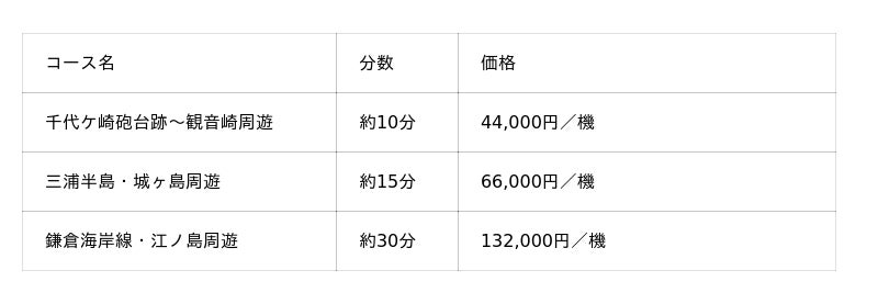 ※1機あたりの料金。最大3名まで同一料金で搭乗可能。1機あたりの重量制限は220kgまで
