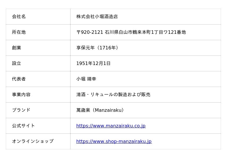 株式会社小堀酒造店(本社:〒920-2121 石川県白山市鶴来本町1丁目ワ121番地、代表取締役:小堀 靖幸、以下「萬歳楽」)は、世界的な酒類コンペティション IWSC 2025(International Wine & Spirit Competition) において、リキュール部門のプロデューサートロフィー(生産者賞)の最終候補(ショートリスト) に選出されました。