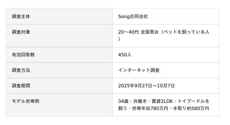 Song合同会社は、20~40代の全国男女(ペットを飼っている人)450名を対象に、ペット関連支出に関するインターネット調査を実施しました。その結果、ペットにかける年間支出は平均で31.4万円に上ることが明らかになりました。特に「家族同然の存在」としての意識が高まる中、支出傾向にも“推し活”さながらの熱量が見られます。