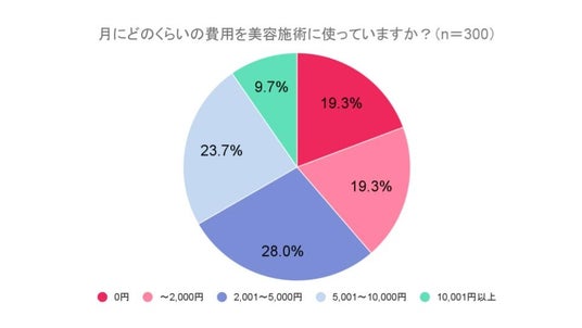 「月にどのくらいの費用を美容施術に使っていますか?」(n=300)という質問に対して、2,001円~10,000円の価格帯に51.7%が集中しており、特に2,001~5,000円が28.0%と最多となりました。
