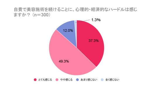 「自費で美容施術を続けることに、心理的・経済的なハードルは感じますか?」(n=300)という質問に対し、86.6%が何らかのハードルを感じていることが判明しました。