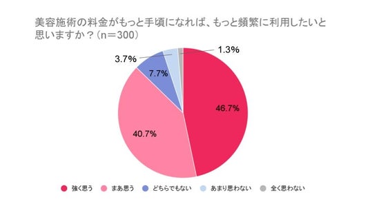 「美容施術の料金がもっと手頃になれば、もっと頻繁に利用したいと思いますか?」(n=300)という質問に対し、87.4%が肯定的な回答をしました。