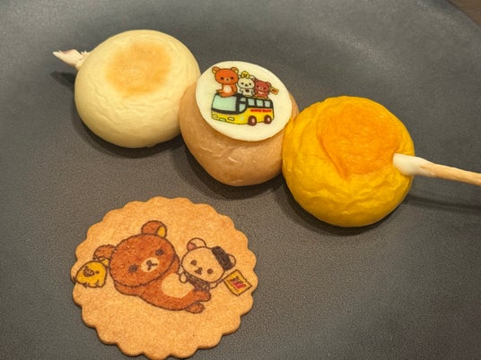 ツアー限定オリジナルデザート(コリラックマ、リラックマ、キイロイトリ各キャラクターの3色を菓子パンで表現)