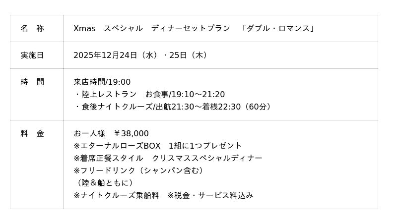 「ダブル・ロマンス」~陸と海の饗宴。陸上でゆったりとディナーを楽しむ時間と、食後に夜景とフリードリンクを満喫するロマンティックなクルーズの2部構成。他にはない新しいクリスマス体験をお届けします。