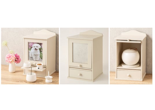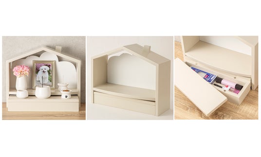 お仏壇は2タイプ。色はアイボリーを基調にしており、インテリアにマッチしやすいようにデザインしました。引き出しにはお線香やろうそくが収まります。