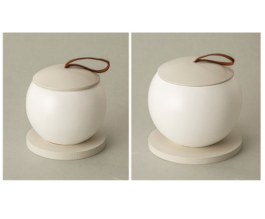 お仏具は花立て、香炉、ろうそく立て、水入れ、供養皿の5点セットです。骨壺も2つのサイズからお選びいただけます。ストーンウェア製で耐久性に優れており、温かみのある質感です。