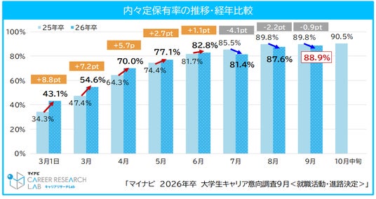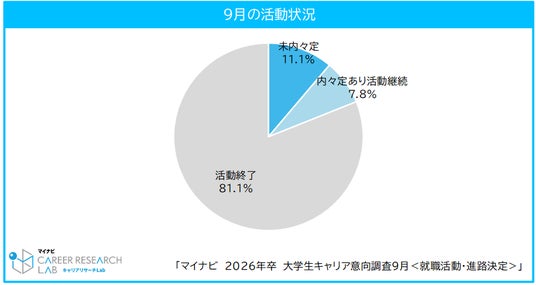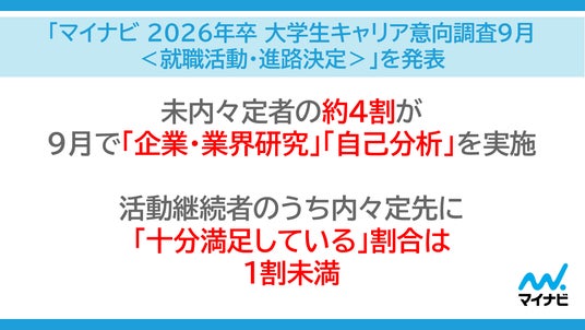 株式会社マイナビ(本社:東京都千代田区、代表取締役 社長執行役員:土屋芳明)は、2026 年卒業予定の全国の大学生、大学院生を対象に実施した、「マイナビ2026年卒大学生キャリア意向調査9月<就職活動・進路決定>」の結果を発表しました。
