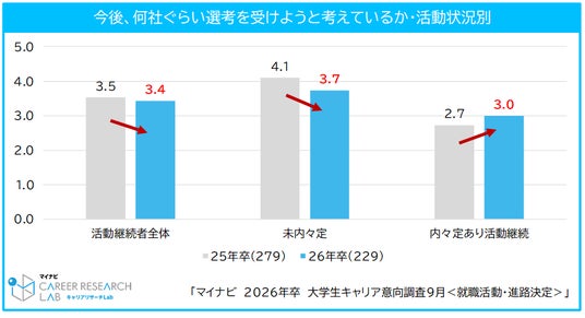9月末時点での活動継続者の内訳をみると、未内々定者が11.1%、内々定を持ちながら活動を継続している割合(内々定あり活動継続者)は7.8%だった。活動継続者が今後選考を受けようと考えている社数は、全体で3.4社(前年比0.1pt減)となり、未内々定者は3.7社(前年比0.4pt減)だったが、内々定あり活動継続者は3.0社(前年比0.3pt増)で、前年より活発化している様子がうかがえる。