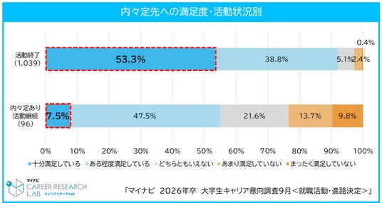 未内々定者の約4割が9月で「企業・業界研究」「自己分析」を実施。活動継続者のうち内々定先に「十分満足している」割合は1割未満