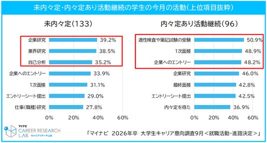 内々定状況別に9月の活動内容を見てみると、未内々定者は「企業研究(39.2%)」「業界研究(38.5%)」「自己分析(35.2%)」などが多く、具体的な選考の前段階の活動に取り組んでいるようだ。内々定あり活動継続者は、「適性検査や筆記試験の受験(50.9%)」「1次面接(48.9%)」「企業へのエントリー(48.2%)」など、実際の選考に関する取り組みが多いが、これらは採用選考の比較的初期段階のものだ。