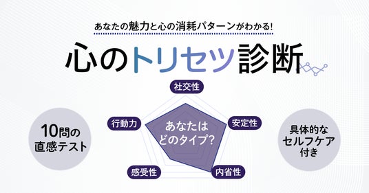 回答結果から、あなたの“心の消耗パターン”と“本来の魅力”を分析し、今日からできる具体的なセルフケアアドバイスもお届けします。自分の心を少しでも軽くしたい、頑張りすぎる自分を見つめ直したい方にぴったりの診断です。