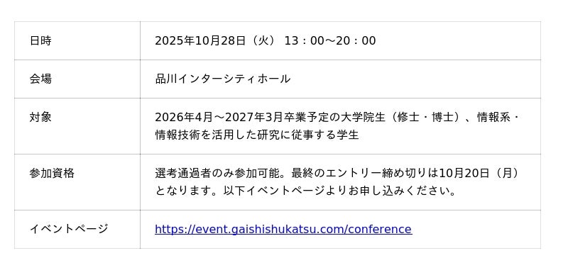 近年の就職活動は選考開始時期の早期化による影響で、修士1年の春から企業との接点を持つ必要性が高まっています。しかし、理系大学院生にとってこの時期は研究テーマの確立や実験の立ち上げ段階で、本来は研究に集中すべき時間を就活準備に充てなければいけない現状があります。また、一般的なエントリーシートや面接では、論文執筆や研究などで培った論理的思考力や専門性が十分に評価されづらいという課題があります。一方で採用企業からは、より特定の専門性が高い領域(AI、データサイエンス、セキュリティなど)に素養がある学生の採用ニーズが増加しています。このような学生と企業双方の課題に対し、「外資就活Conference」は研究そのものを評価対象とすることで、学生が一番時間を費やすべき研究を犠牲にせず、採用企業も研究成果を通した本質的なポテンシャルの見極め、専門領域の理解が実現できる場の創出を目指します。