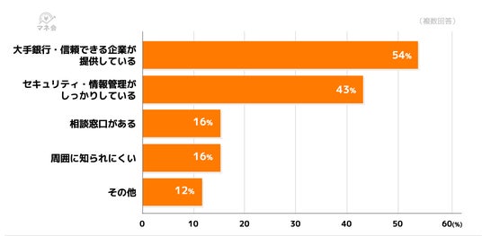 安心感を与える要素として最も多かったのは「大手銀行や信頼できる企業が提供している」(54%)で、次いで「セキュリティ・情報管理がしっかりしている」(43%)が挙げられました。