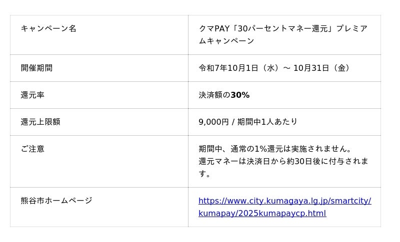 かねてよりお客様の利便性向上のため、地域電子マネー「クマPAY」を導入しておりましたが、この度、熊谷市が地域経済の活性化を目的として実施する「クマPAY『30パーセントマネー還元』プレミアムキャンペーン」の対象店舗となりましたことを、改めてお知らせいたします。