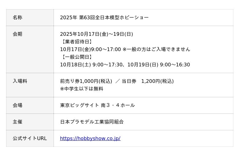 セメダイン株式会社(本社:東京都品川区、代表取締役会長兼社長:水澤伸治)は、東京ビッグサイト(東京都江東区有明)で2025年10月17日(金)から開催される『2025年 第63回全に品模型ホビーショー(主催:日本プラモデル工業協同組合)』に出展します。