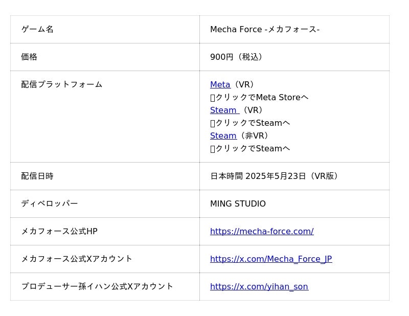 Steamページ(ウィッシュリスト登録受付中):https://store.steampowered.com/app/4036130/Mecha_Force/
