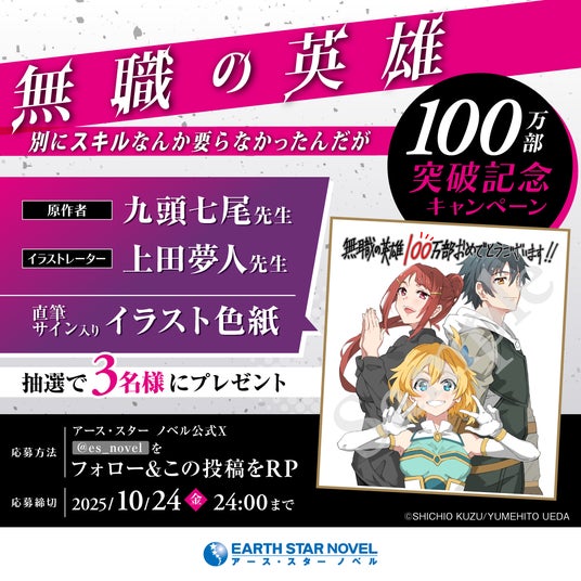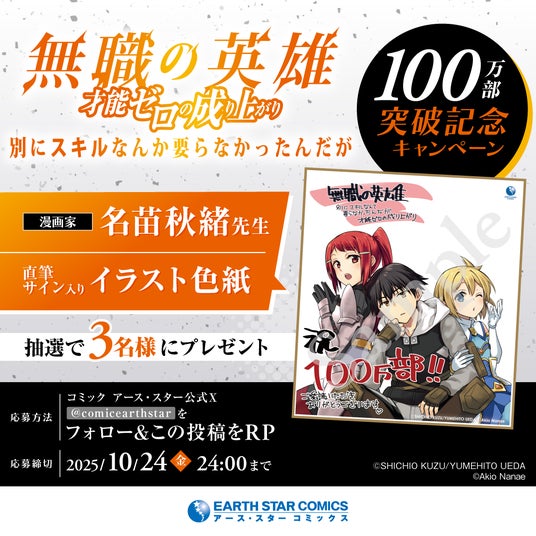 このたび、株式会社アース・スター エンターテイメント(東京都・品川区)が刊行する【アース・スター ノベル】と【アース・スター コミックス】の人気作品『無職の英雄 別にスキルなんか要らなかったんだが』がシリーズ累計100万部を突破いたしました。