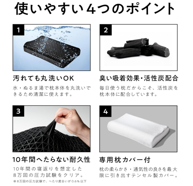 さらに、柔らかい肌触りと高い保湿性が特徴のテンセル素材でできた枕カバーが付属し、寝心地を引き立てますよ。