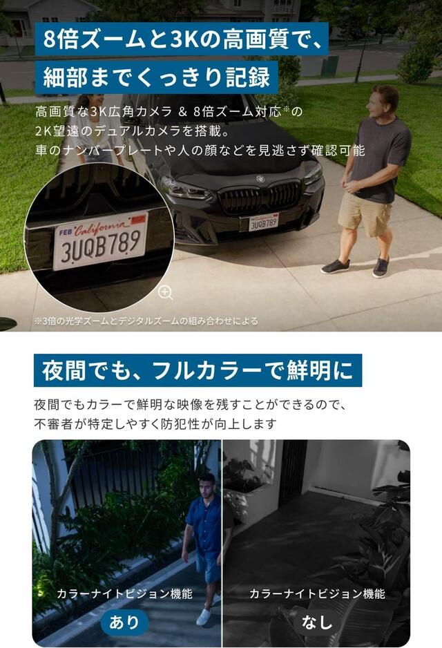 水平方向に360°、垂直方向に70°の広範囲撮影が可能で、玄関先や駐車場などに設置すれば死角を作らず見守りが可能。3K高画質の広角カメラと2K望遠ズームカメラ(最大8倍ズーム)を備え、車のナンバーや人物の顔まではっきり捉えます。夜間もカラー撮影が可能なので、不審者の特定にも役立ちますよ。