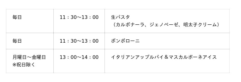 フロマージュロールケーキ、チョコレートバスクチーズケーキ、チーズクリームのみかんタルト、マスカルポーネと紅茶のヴェリーヌ、抹茶のレアチーズ、パルメザンパウンドケーキ、ティラミス、ボンボローニ、イタリアンアップルパイ、フルーツ2種、白玉あんみつ、アイスクリーム 他