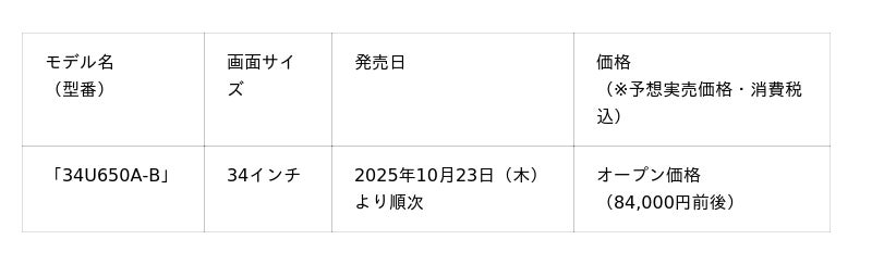 LGエレクトロニクス・ジャパン株式会社(代表取締役:孫 成周(ソン・ソンジュウ)、本社:東京都中央区)は、21:9曲面型ウルトラワイド(TM)モニターの新モデルとして、34インチIPSパネルを採用した「34U650A-B」を、2025年10月23日(木)より順次発売します。