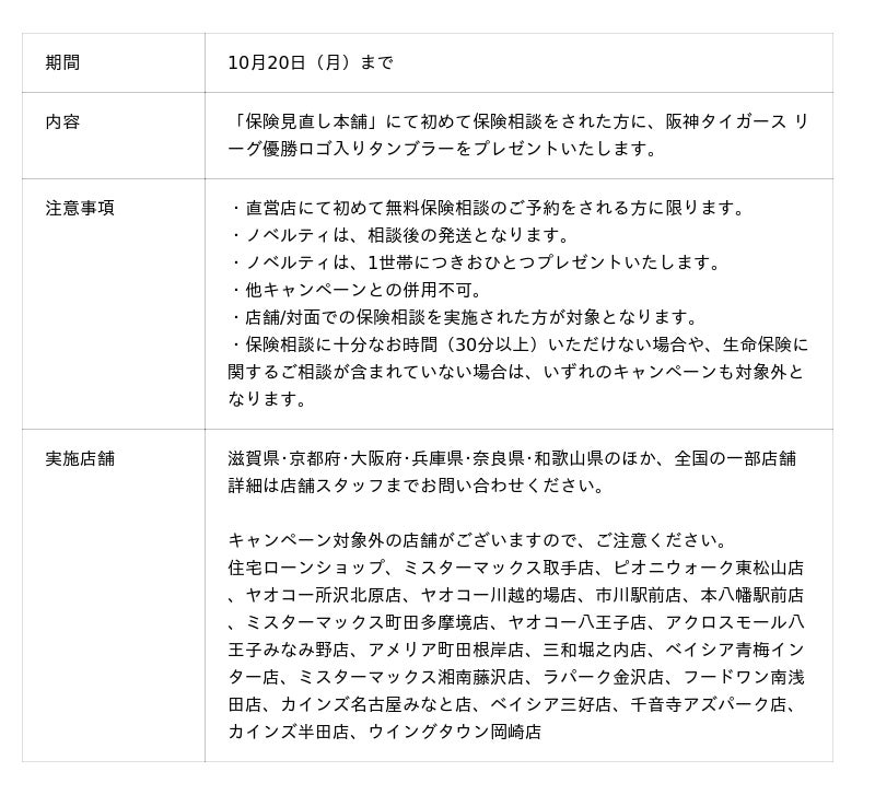 現在、店頭で無料相談にお越しいただいた方を対象に、阪神タイガース リーグ優勝ロゴ入りタンブラーをプレゼントするキャンペーンを2025年10月20日まで実施しております。