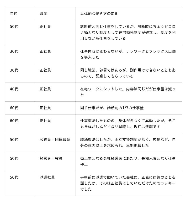 当社が「がんとお金」をテーマにした調査は3回目となりましたが、がんの治療をしながら働き続けるという考え方は広まってきているようです。前回の調査に比べて、がんを理由に離職する人の割合は減っています。しかし、依然として「遠回しに離職を促された」といった声もあり、がん経験者の就労を社会全体で支援していく必要性を改めて感じています。