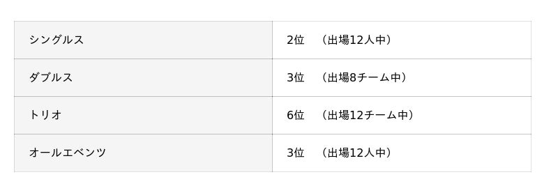 今回の大会では、シングルス銀メダル、ダブルス銅メダル、オールエベンツ(個人、ダブルス、トリオの合計16ゲームの点数)で銅メダルという結果でした。次回は金メダルを目指します。