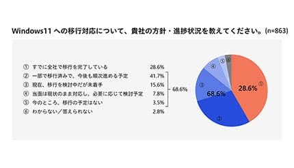 調査対象者に、勤務先のWindows 11への移行に関する方針や進捗状況を尋ねたところ、「すでに全社でWindows 11への移行を完了している」という回答は28.6%に留まった。5月に実施された前回調査から4.4ポイント増加したものの、依然として68.6%の企業が未移行であることが明らかになっている。
