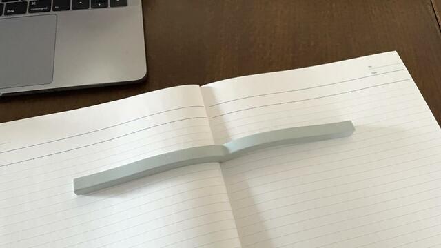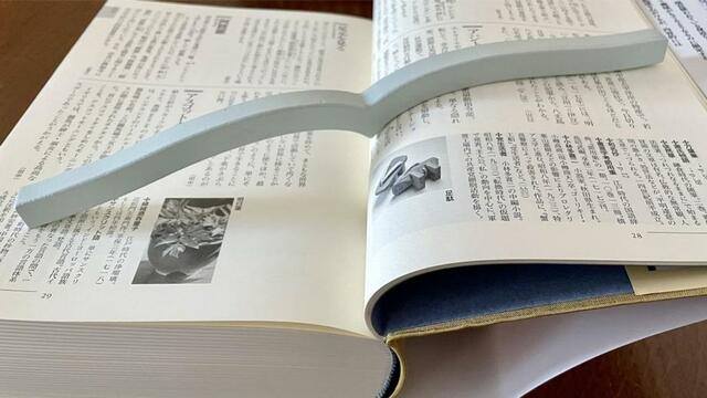 開いた本に沿った形をしている文鎮で、読みたいページに置くだけで状態を保持してくれます。
