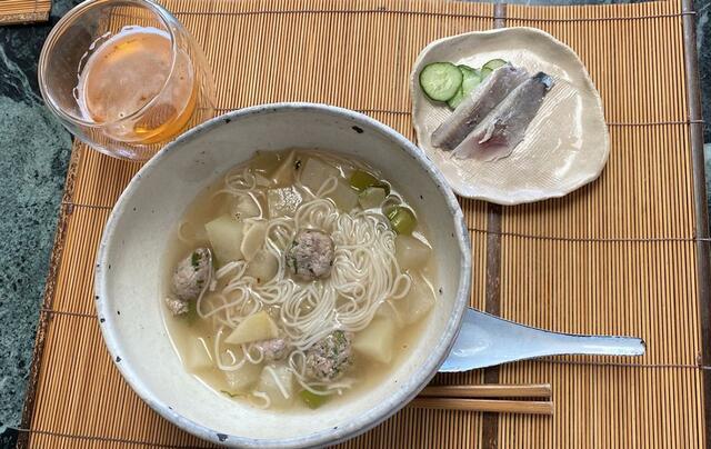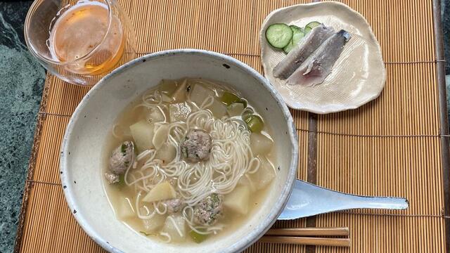 冬瓜と鰯団子の煮麺、鰯の甘酢漬け。しっかり寝たはずなのに、食欲なし!