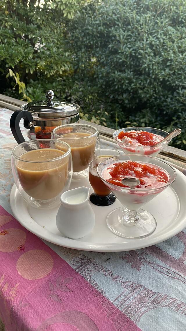 紅茶、今日の元気、Yoghurt。昨夜は深く眠れました。これで時差ボケ解消かも。