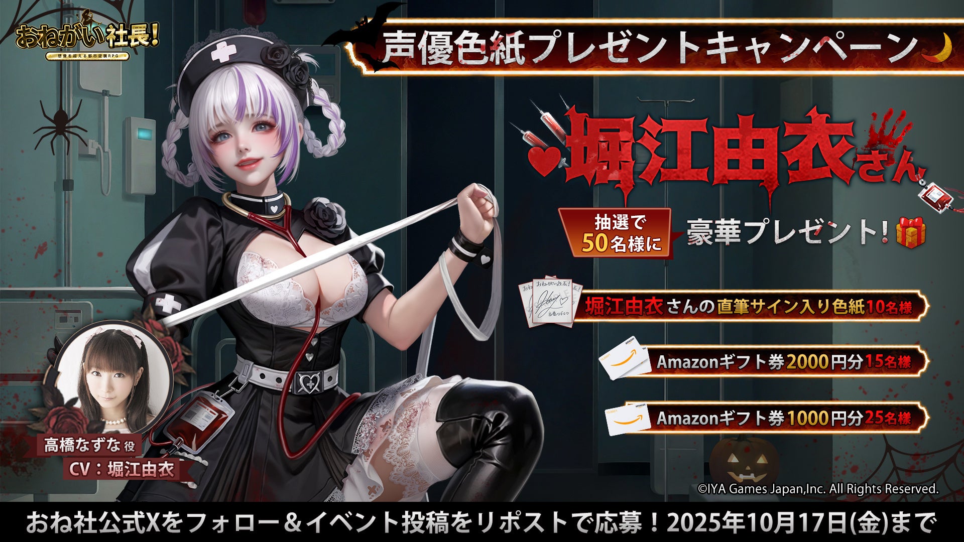 会社経営シミュレーションゲーム「おねがい社長!」に新規秘書、看護師「高橋なずな(CV:堀江由衣)」が2025年10月11日(土)から登場します。CV公開記念の抽選イベントも開催されますので、ぜひお見逃しなく!